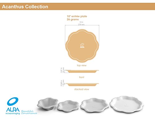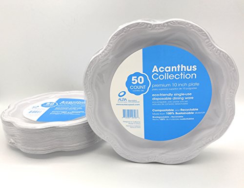[50 COUNT] 10" inch Disposable Floral Large Premium White Plates Acanthus Collection Natural Sugarcane Bamboo Fibers Bagasse 100% By-Products Eco Friendly Environmental Plastic Paper Plate Alternative