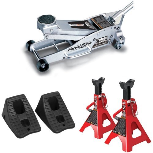 The Powerzone Heavy Duty Steel and Aluminum Garage Jack lifts from 4 inch to 18-1/4 inch and supports 3 tons. The jack has a lightweight aluminum frame and heavy duty steel lift arm for strength and durability. The quick lifting hydraulic system saves time and is equipped with safety valve to prevent overloading beyond rated capacity. The jack is equipped with a rubber padded saddle and a foam covered handle to protect vehicle frame. Real wheels swivel for easy movement and positioning over rough surfaces.Feature