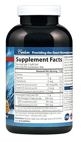 From the deep, pristine waters near Norway, Carlson provides the finest cod liver oil, naturally rich in EPA and DHA, and supplying Vitamins A & D. Natural Vitamin E has been added to each 1000 mg soft gel to protect the freshness of EPA & DHA, both within the soft gels and our bodies.Feature