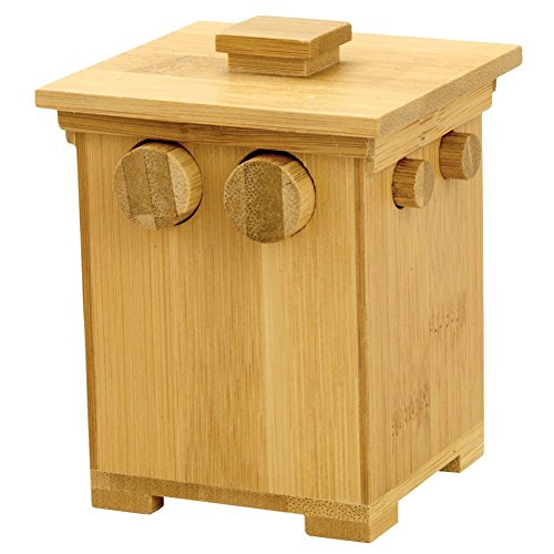 -. Feature : Can you figure out the secret to unlocking and re-locking the cover to this attractive bamboo box? / The secret lies in manipulating the four pegs under the cover. / A wonderful place to store small treasures. / Box measures 4" x 2-5/8" x 2-5/8". Solution included