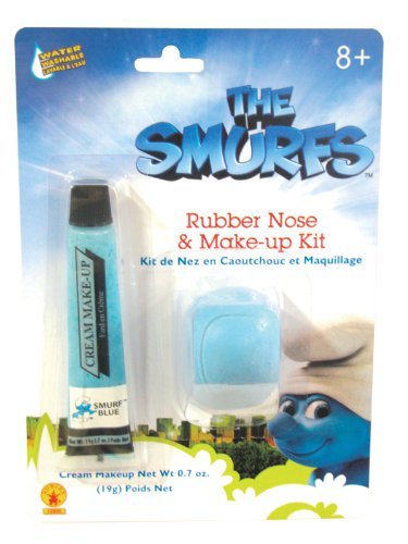 -. Binding : Toy -. Brand : Rubie's -. ClothingSize : One Size -. Color : multi-colored -. Department : boys -. EAN : 0082686199964 -. Feature : One tube of blue water washable cream makeup and rubber Smurf nose / Great for Halloween, party time, play time or any time / Officially licensed Smurfs merchandise / Add a tattoo, wrapped present, or glasses to be whatever smurf you want -. IsAdultProduct : 0 -. Label : Rubies - Domestic -. Manufacturer : Rubies - Domestic -. Model : 19996 -. MPN : 19996_ -. NumberOfItems : 1 -. PackageQuantity : 1 -. PartNumber : 19996_ -. ProductGroup : Toy -. ProductTypeName : CHILDRENS_COSTUME -. Publisher : Rubies - Domestic -. ReleaseDate : 2011-09-28 -. Size : One Size -. Studio : Rubies - Domestic -. Title : Rubies The Smurfs, Smurf Makeup Kit -. UPC : 082686199964 -. Warranty : No Warranty