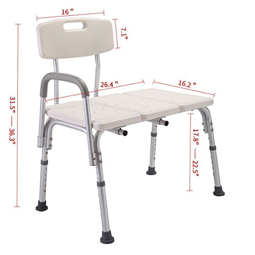Description: This transfer shower chair features excellent anti-sliding performance, suitable for bathroom use especially. It is easier for the disabilities and elder to shower, providing a safe and comfortable bathing and showering for the users. Come and try one! Specifications: Color: White Material:?Aluminum High-density polyethylene Weight Capacity: 300 lbs. Net Weight: 8.46 lbs 10-level of seat height adjustments from 17.7"-22.4" Seat Base Dimension: 26.4" x 16.2" Back Dimension: 16' x 7.1' Back Height to the ground: 31'-36' Package Including: 1 x Medical Shower Chair 1 x Assemble Manual 0