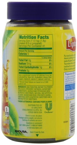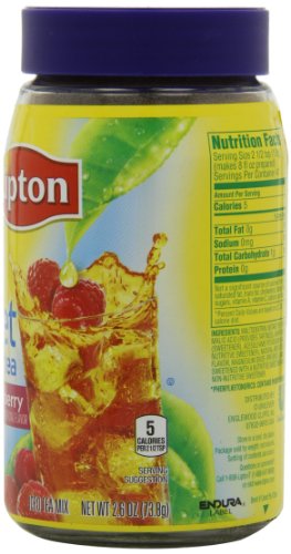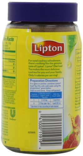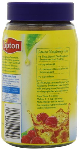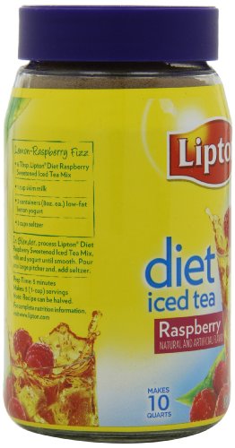 -. Binding : Grocery -. Brand : Lipton -. Feature : Enjoy the refreshing taste of iced tea and the sweet, tart taste of raspberries / Pack of four 2.6-ounce jars / makes 10 Quart / 100% natural, zero calorie, sugar free, no added preservatives and colorings / Thirst-quenching and delicious this iced tea mix is brewed from real tea leaves / Combine iced tea mix as per your taste with 8 fl oz water and get instant refreshment any time -. Label : Lipton -. Manufacturer : Lipton -. MPN : U-B004M8O3BI -. NumberOfItems : 4 -. PackageQuantity : 4 -. PartNumber : U-B004M8O3BI -. ProductGroup : Grocery -. ProductTypeName : GROCERY -. PublicationDate : 2011-02-04 -. Publisher : Lipton -. Size : 8 Ounces -. Studio : Lipton -. Title : Lipton Iced Tea Mix, Diet Raspberry 2.6 Ounce (Pack of 4)