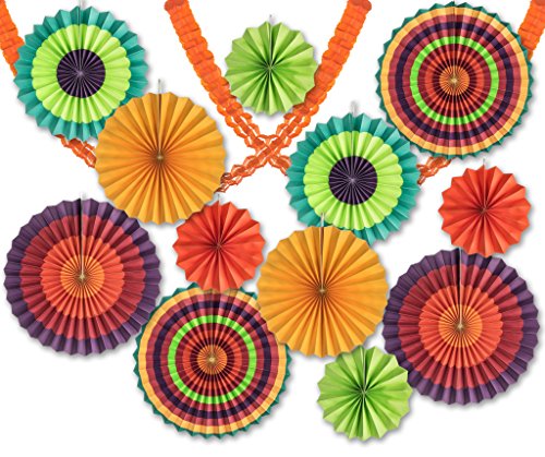 14 Pack - Colorful Fan and Streamer Decoration Pack - 12 Fans and 2 Streamers - Perfect for Birthday Parties, Baby Showers, and Mexican Fiestas