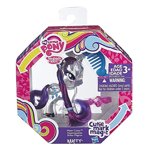 -. Binding : Toy -. Brand : My Little Pony -. EAN : 0885256826495 -. Edition : 1st -. Feature : My Little Pony figure looks like Rarity / Figure's wings are filled with water and glitter / Includes barrette and comb -. IsAdultProduct : 0 -. Label : My Little Pony -. Manufacturer : My Little Pony -. Model : B0734AS0 -. MPN : B0734AS0 -. PackageQuantity : 1 -. PartNumber : B0734AS0 -. ProductGroup : Toy -. ProductTypeName : TOYS_AND_GAMES -. Publisher : My Little Pony -. Studio : My Little Pony -. Title : My Little Pony Cutie Mark Magic Water Cuties Rarity Figure -. UPC : 630509257577 -. Warranty : No Warranty