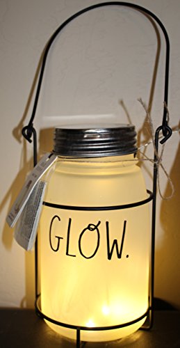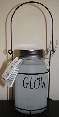 Rae Dunn by Magenta GLOW in large letters Frosted Mason Jar Tea Light Candleholder with Lighted Interior on Carrying Rack with Handle.