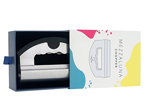 - EASY-TO-USE DESIGN - The chopper has a comfortable round handle that gives you a firm grip; FAST & PRECISE - The double blade mezzaluna chopper increases your chopping speed and cuts the chopping time in half; The two blades have sharp, side-by-side edges, allowing you to chop your favorite ingredients uniformly into smaller pieces; CONVENIENT & USER FRIENDLY - Ready to use! Wash it in warm, soapy water to clean. Simply store it in the drawer box