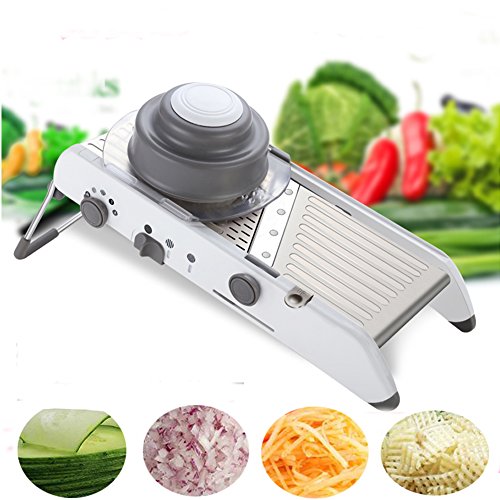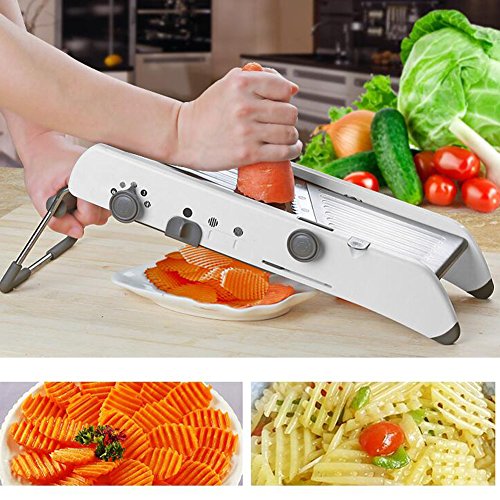 Multifunctional: Mandoline Slicer can shred various fruits and vegetables in different lengths, thickness and shapes; Slice, julienne and waffle cutting options with 4 adjustable slicing thicknesses that vary from 1mm, 3.5mm, 5.5mm and 7.5mm