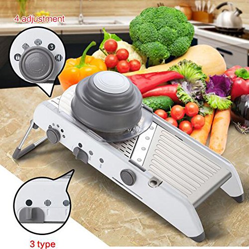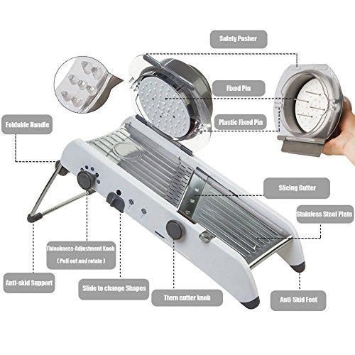 Safe to Use: Adjustable mandoline with safety hand guard to protect your hand from being cut when you use the slicer. The four stainless steel pins can fix the food firmly. Anti-skidding handle and feet can be perfectly fixed in smooth surface, avoid getting any hurt during the operation