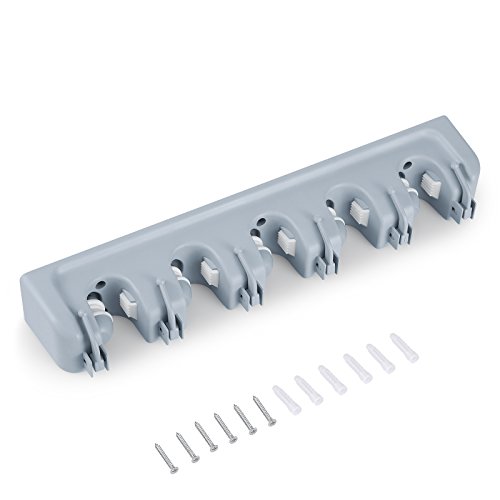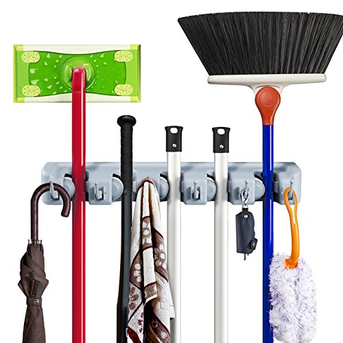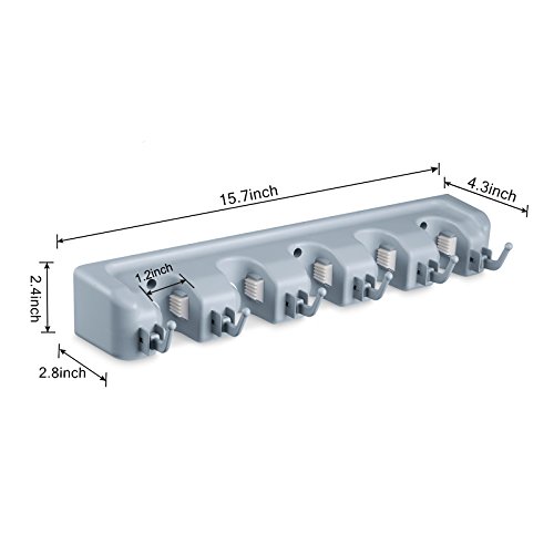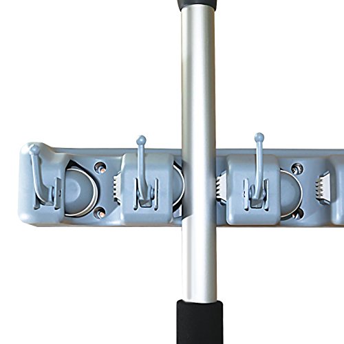 5 ball slots and 6 hooks design, broom holder with spring loaded, double rubber gripped slots give Mop and Broom Holder provide a solution organize your cleaning tools all
