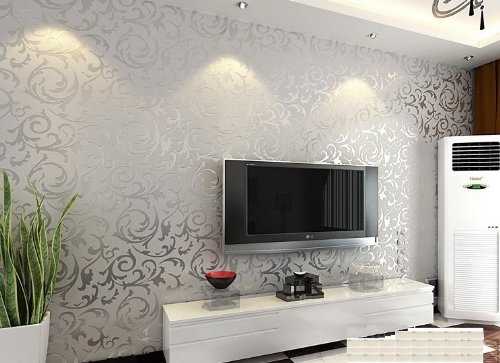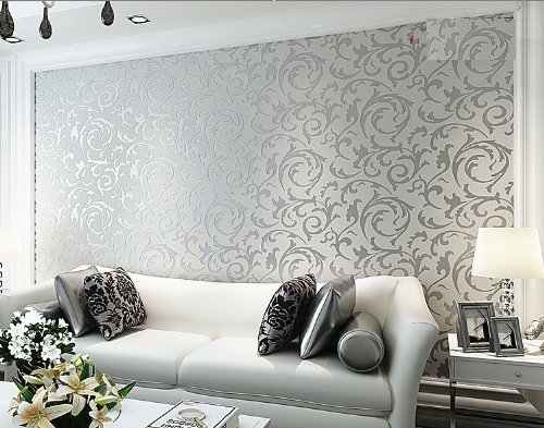 -. Title : 10m Length Sliver&gray Netherland Victorian Damask/embossed Textured Wallpaper