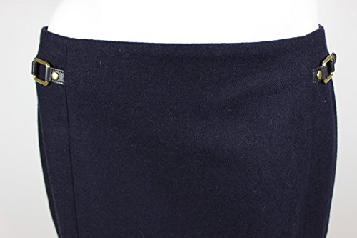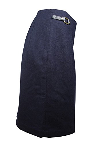 This navy straight lined skirt by Tommy Hilfiger is crafted in wool blend with polyester lining and is designed with fitted silhouette bandless waist, panel cut front embellished with post and eye tab at side panelFeature