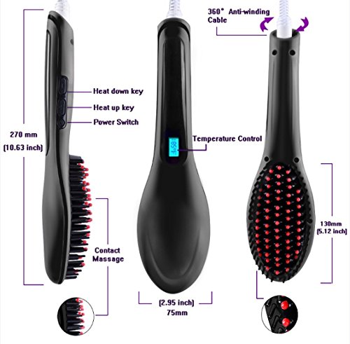 Health Care for Your Hair: This hair brush straightener works in a low temperature which won't damage our hair, Anti-static technology reduces the amount of negatively charged particles during styling. Diminish frizz and fly while boosting style control.