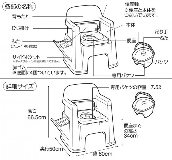 | 付属品 | 専用バケツ(本体装着済)、専用消臭液、便座カバー(ブルー)、取扱説明書 |
