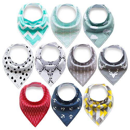 10-Pack Stylish and Practical Baby Bandana Bibs That Both Moms and Babies Love -- A variety set including 10 different designs of baby bandana drool bibs, which not only helps to keep mommy's drooly / teething baby dry and neat, but also are stylish accessories for babies daily outfit.