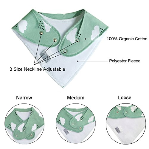 Soft and Super Absorbent Drool Bibs that Protect Your Baby from Drool Rash -- The front layer is made with 100% Organic Cotton to absorb drools, dribbles and spit ups; the back layer is thick polyester fleece which keeps the fluid from soaking into baby’s clothing, thus keep your baby dry all day, and free from check,neck and chin rash.