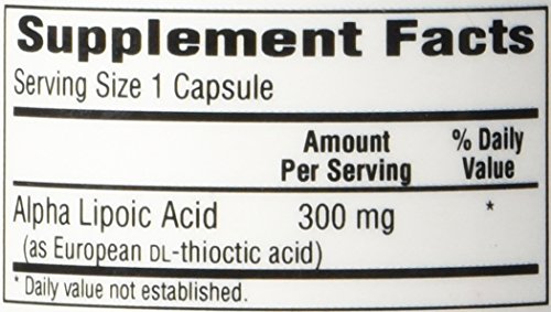 Lipoic 300 mg 100 caps Dietary Supplement Suggested Use: One capsule per day or as directed by a healthcare professional Supplement Facts Serving Size 1 Capsule Amount Per Serving Alpha Lipoic Acid 300 mg (as European DL-Thioctic Acid) Other Ingredients: Microcrystalline cellulose gelatin capsule (Kosher and Halal certified) Contains NO: Dairy egg fish shellfish nuts wheat gluten soy sugar yeast artificial preservatives or colors. Keep out of the reach of children. Safety sealed for your protection. Store tightly closed in a cool dry place.