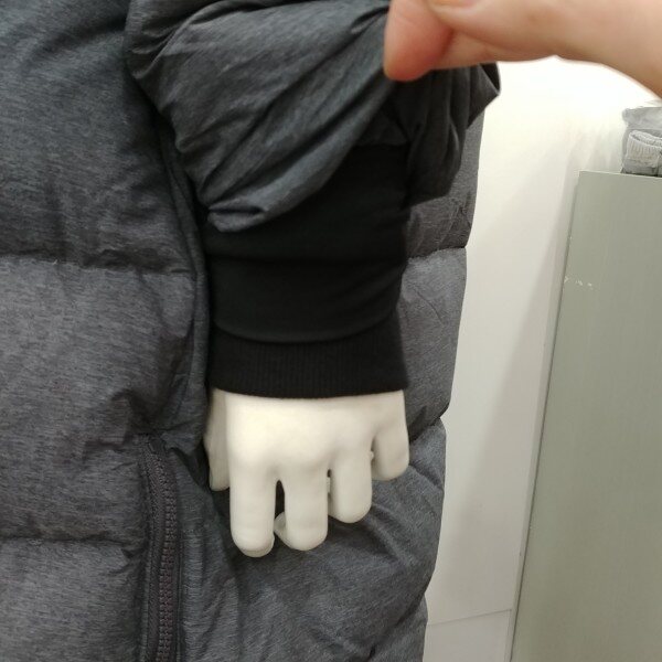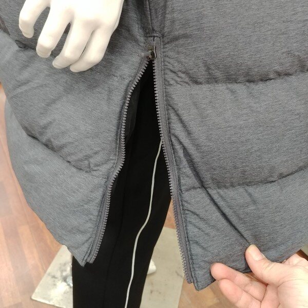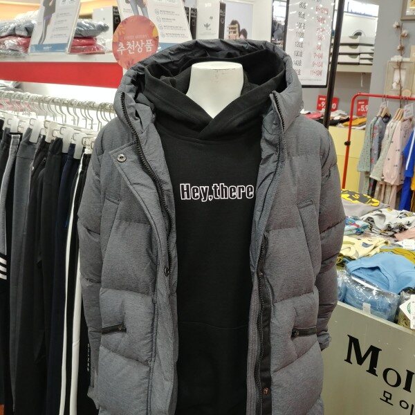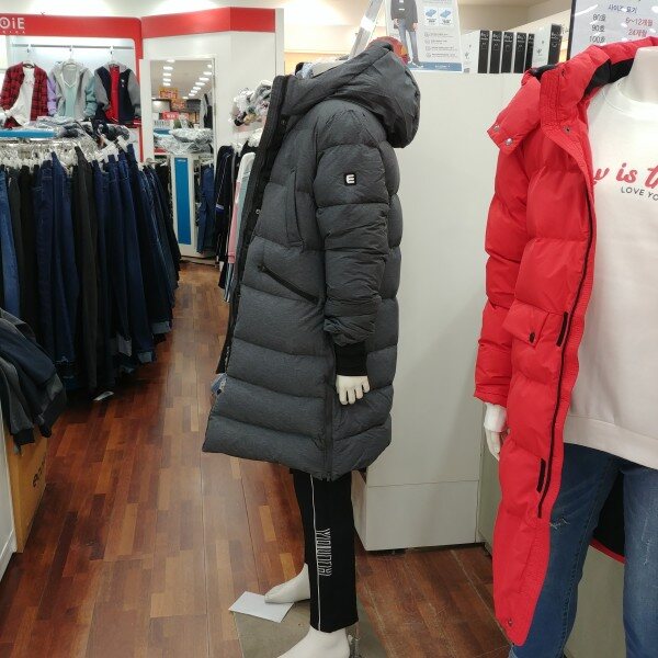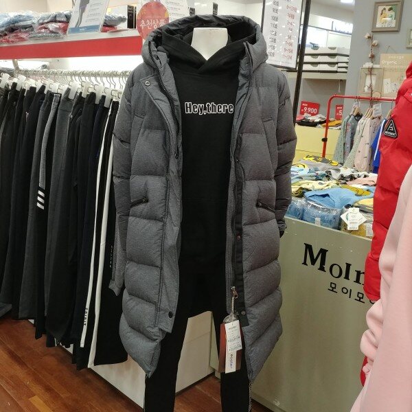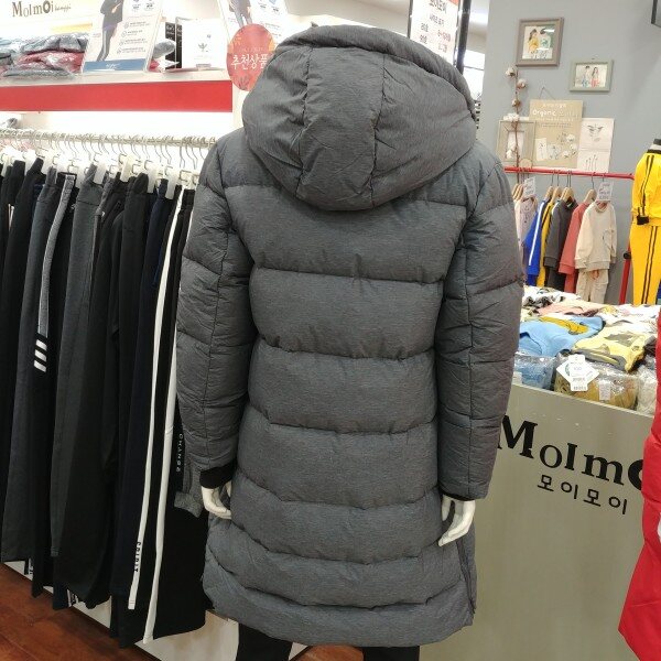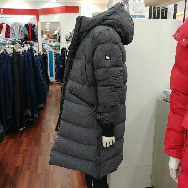 롱코트 길이보다 약간 짧은 길이 입니다.어찌 보면 가장 적당한 길이라 졸 수 있습니다.원단의 깊은 그레이의 칼라가 클래식 합니다.솜털의 비율이 80%로 가볍고 따뜻합니다.