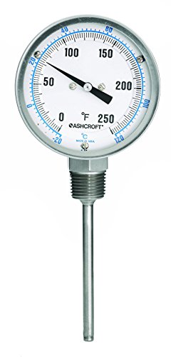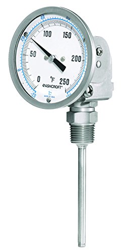 Ashcroft Series EI Stainless Steel Case Bimetal Thermometers, 5" Dial Size, 1/2" NPT Every angle Connection, 9" Stem Length, 100/800 Degrees Fahrenheit