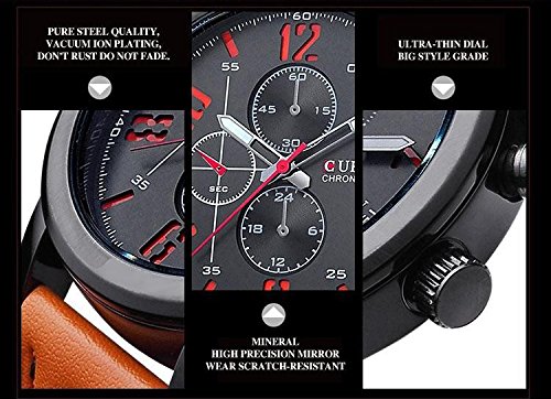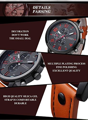 -. Feature : Analog dress watch casual design, leather band, roman number time mark with the simplicity of business casual, bring you back to the classic. / Sport outlook, alloy case, quality scratch resistant glass. / This is a kind of design style, the feature is simple and clean, which reflects the elegant taste and ideas. / Living waterproof design (Not suitable for swimming, diving, shower etc) / Three decoration sub dials, non functional.