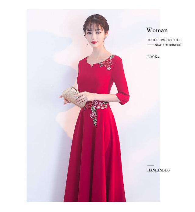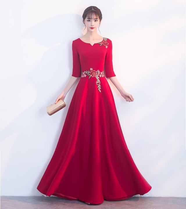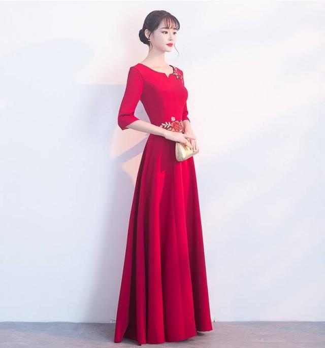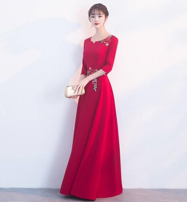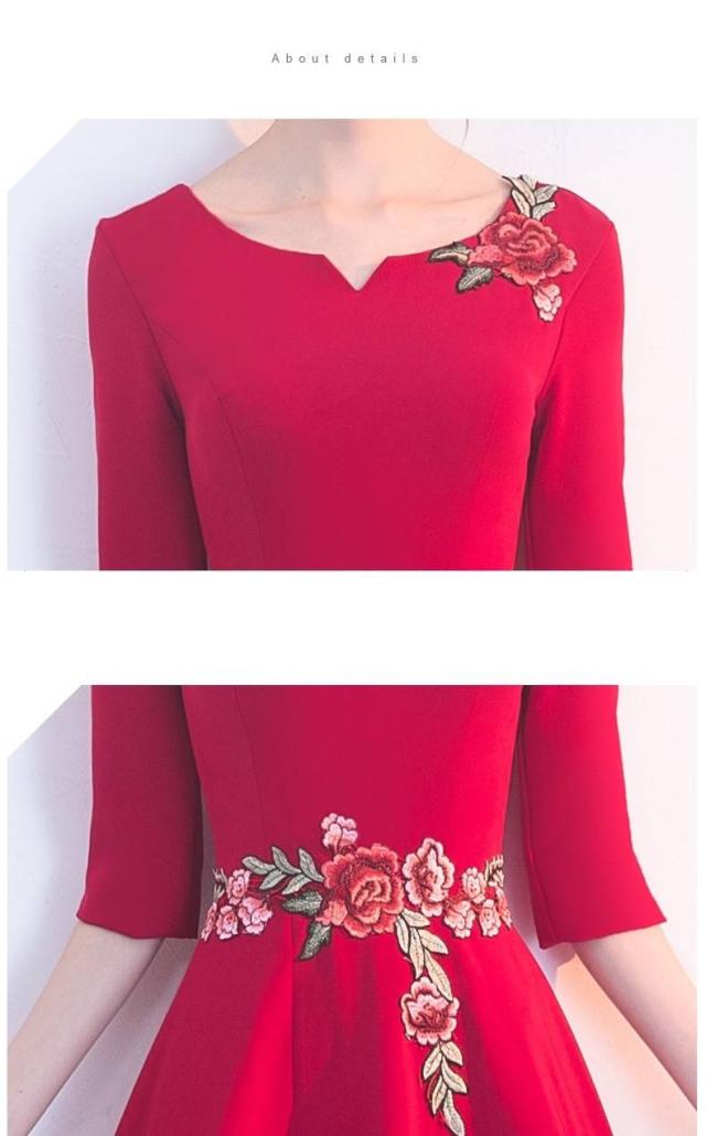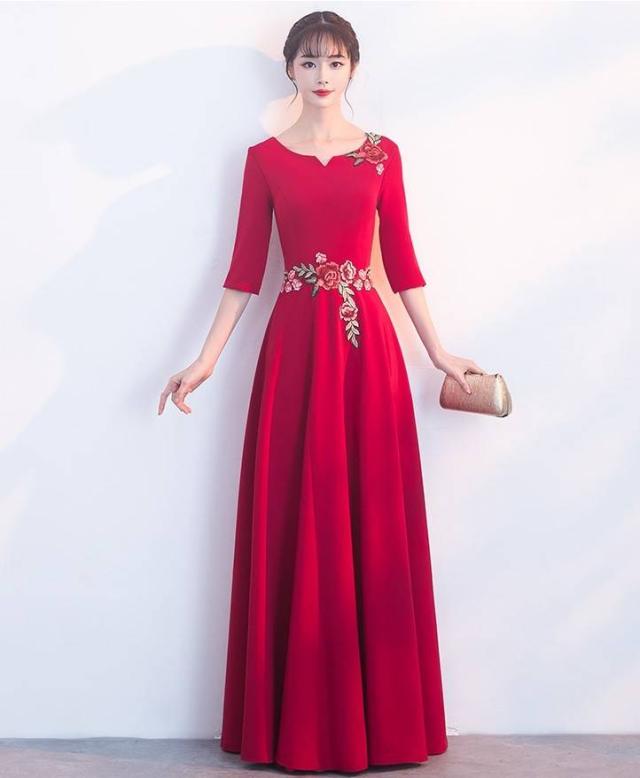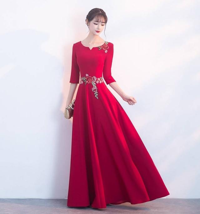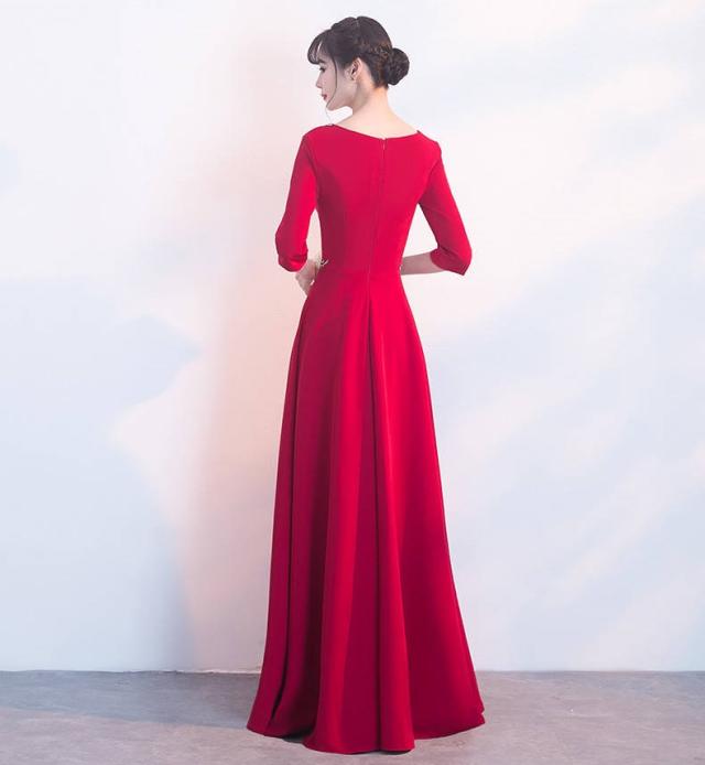 パーティードレス 結婚式 ワインレッド 五分袖 Uネック 二次会 謝恩会 披露宴 卒業パーティー 成人式