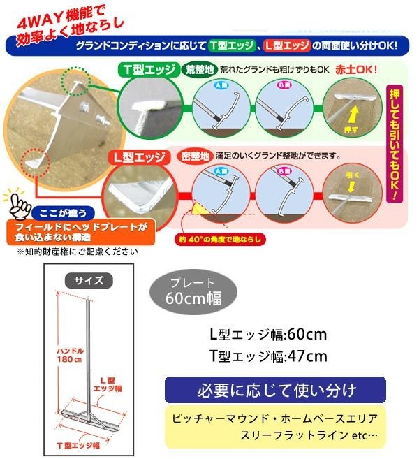 | 校庭や河川敷など、黒土・赤土のグランドでも使えるアルミ合金製レーキ♪4WAY機能で効率よく地ならし!グランドのコンディションに応じてT型エッジ、L型エッジの両面使い分けOK! |