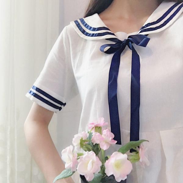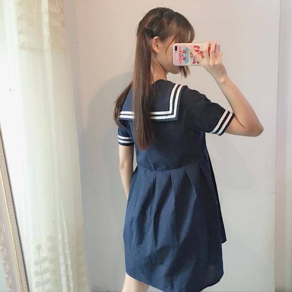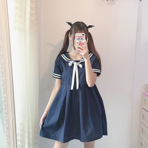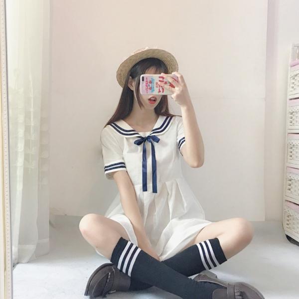 襟元と袖のストライプがデザインのアクセントになったマリン風ワンピース。