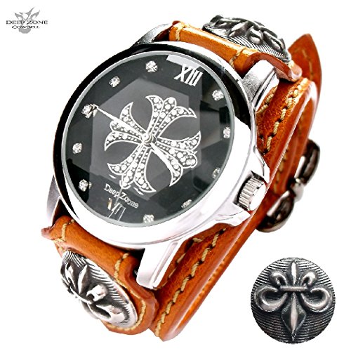 -. Feature : カットガラスが美しいラウンドケース、ジルコニアクロス文字盤 / 独特の艶のイタリアンレザーのベルトにリリィコンチョ(ピューター製) / ◆ ケースサイズ : 38mm × 8mm ◆ 素材:ステンレス / ◆ ムーブメント:国産 ◆ 防水:日常生活防水 ◆ 保証書付 / ◆ 有効着用サイズは:約16cm~19cm ◆ レザーブレスウォッチ専用ケース