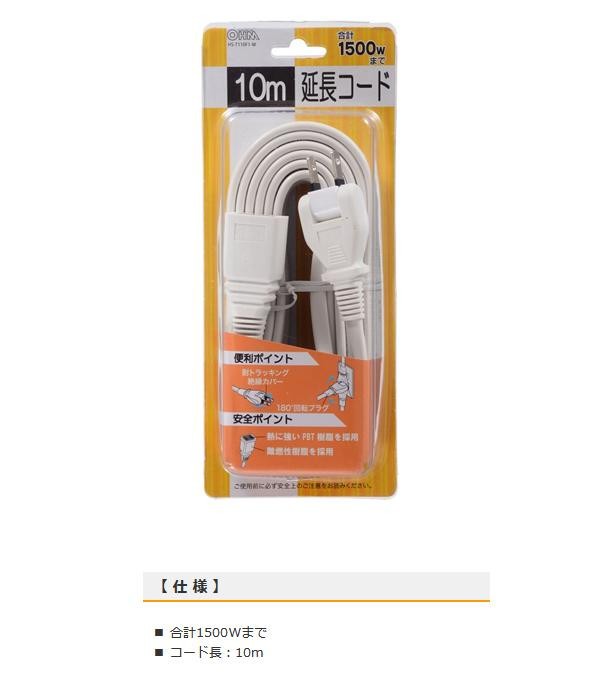 絶縁カバー付き180度回転式プラグを採用した10m延長コードです。熱に強いPBT樹脂、難燃性樹脂を採用しています。