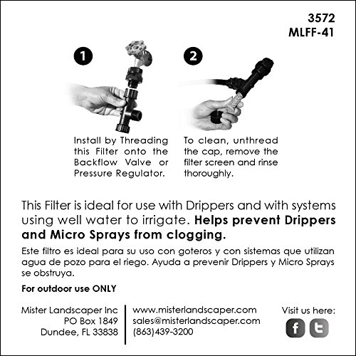 Studio : Mister Landscaper Publisher : Mister Landscaper Product Description This Faucet Filter utilizes a 50 mesh screen to filter dirt and other debris from the water. With 3/4-in hose threads, this Filter attaches directly to the Back Flow Prevention Valve or hose threaded fitting. The Filter has a side 3/4-in Hose Thread outlet. Use the 1/2-in Poly Faucet Hose Fitting (MLF-33) to connect the 1/2-in Poly Tubing to this Filter. The inside mesh screen removes easily for cleaning. 0