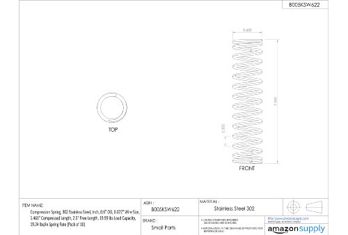 Compression Spring, 302 Stainless Steel, Inch, 0.6" OD, 0.072" Wire Size, 0.41" Compressed Length, 0.62" Free Length, 19.99 lbs Load Capacity, 95.38 lbs/in Spring Rate (Pack of 10)