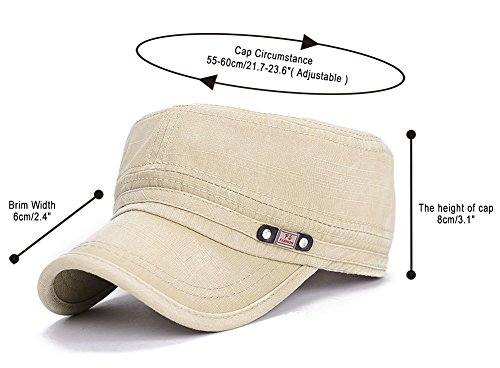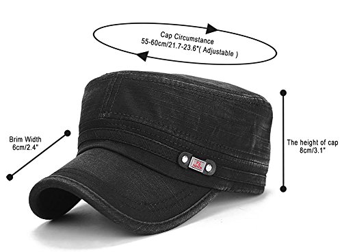 -. Feature : Cadet army cap is made by vintage and durable washed cotton material / Cadet army cap Size: Circumstance: 55~60cm/21.7~23.6"; Brim Width: 6cm/2.4", The height of cap:8cm/3.1", please allow a little differences on sizes due to manual measurements / Cooper buckle on the back can be adjusted according to your need, never deform or change color / Comfortable and breathable sweat band has the function of absorbing sweat and preventing the corps hat from changing color, and the Retro appearance collocated with vintage metal sign, highlights your unique and outstanding temperament / Stereo military hat brim design with fine stitching technology, which makes the military hat shape more fashion, as well as provides more protections against strong sunshine and uv, a great necessity for many outdoor activities: hiking, climbing, fishing and camping