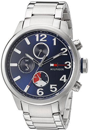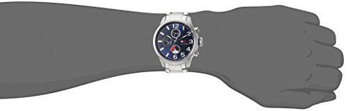Stainless steel case with a stainless steel bracelet. Fixed stainless steel bezel. Blue dial with luminous silver-tone hands and index and Arabic numeral hour markers. Minute markers around the outer rim. Dial Type: Analog. Luminescent hands and markers. Three mutl-function sub-dials displaying: 24 hour, day of the week and date. Quartz movement. Scratch resistant mineral crystal. Solid case back. Case diameter: 44 mm. Case thickness: 13.2 mm. Round case shape. Band width: 22 mm. Deployment clasp. Water resistant at 50 meters / 165 feet. Functions: chronograph, day, date, hour, minute, second. Sport watch style. Tommy Hilfiger Jackson Multi-Function Blue Dial Stainless Steel Mens Watch 1791242.