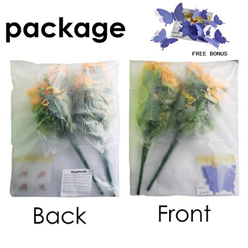 Product specification: The effect picture shown on the main page is 2 bunches of flowers, 7 flowers per bunch.2 bunches per pack. 14 big sunflowers and 60 small sunflowers and 72 leaves in all. The total length is 17.7 inch, the dianeter of big sunflower is 4 inch,the weight of per bunch is 0.24 lb. There are 12 three-dimensional artifitial butterflies as a gift in each order and the color at random,and you can use it to decorate the place where you want.