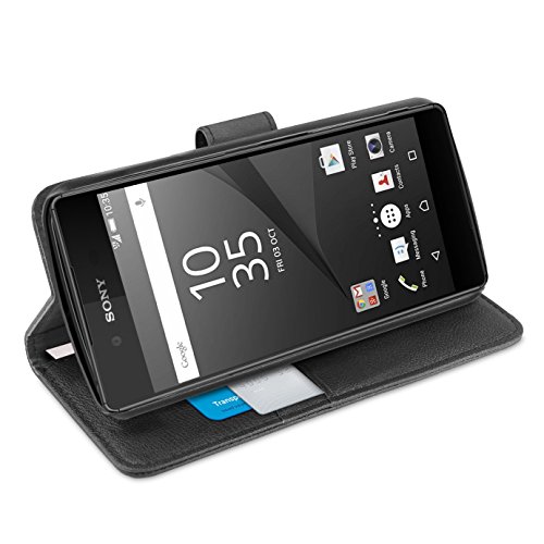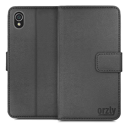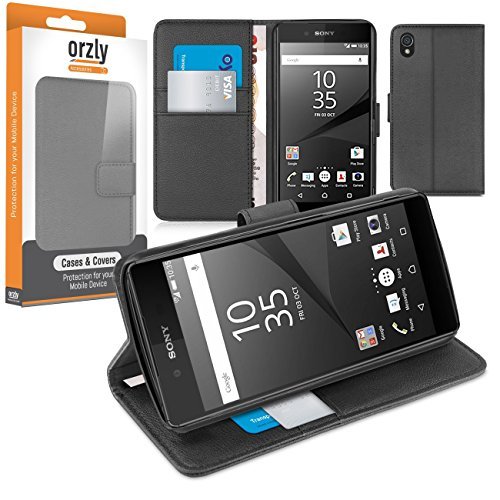 Orzly - Multi-Function Wallet Case for SONY XPERIA Z5 COMPACT (2015 SmartPhone Model / also known as XPERIA Z5 MINI) - BLACK Wallet Case Style Phone Cover with Card Pockets & Integrated Display Stand