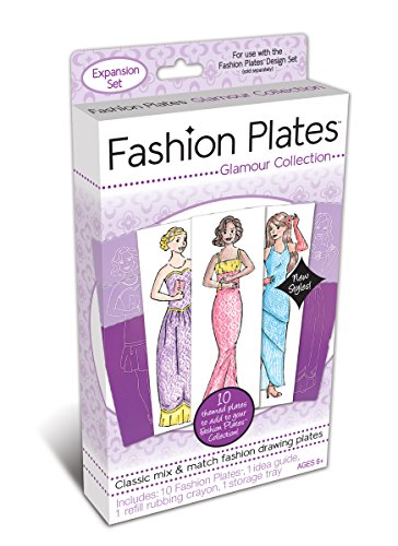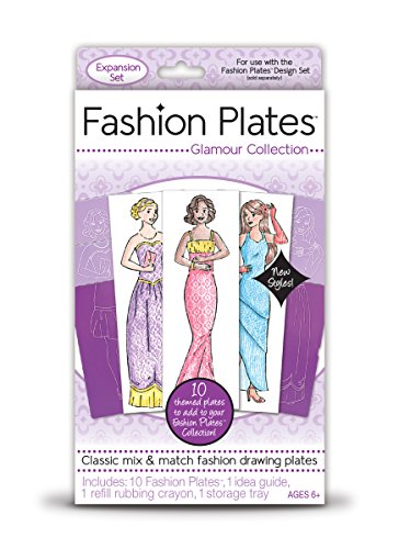 Spice up your Fashion Plates selection with the Glamour Collection Expansion Set—NEW from Fashion Plates! This never-before-seen set includes ten, double-sided weekend styles ready to rock the catwalk. Flip the plate and decorate your designs with the chic built-in textures. The Fashion Plates Glamour Collection Expansion Set also includes is a refill rubbing crayon, idea guide, and storage tray. Mix and match the Glamour Collection with your other Fashion Plates sets to create unlimited luxe looks! Fashion Plates tablet and other Fashion Plates Expansion Sets sold separately.Feature