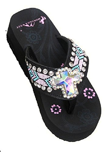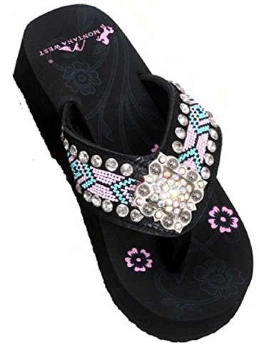 Product Description These Montana West flip flops have aztec straps made of canvas, beaded strap outlined with 2 rows of rhinestones, floral design with the Montana West logo on the top of the sole and a 1.75" Wedge. 0
