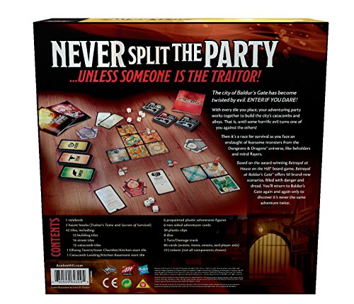 ReleaseDate : 2017-10-20 Studio : FLAHC Publisher : FLAHC Binding : Toy Product Description Never Split the Party…Unless Someone is the Traitor! The shadow of Bhaal has come over Baldur’s Gate, summoning monsters and other horrors from the darkness! As you build and explore the iconic city’s dark alleys and deadly catacombs, you must work with your fellow adventurers to survive the terrors ahead. That is, until some horrific evil turns one?or possibly more?of you against each other. Was it a mind flayer’s psionic blast or the whisperings of a deranged ghost that caused your allies to turn traitor? You’ll have no choice but to keep your enemies close! Based on the award-winning Betrayal at House on the Hill board game, Betrayal at Baldur’s Gate you’ll return to Baldur’s Gate again and again only to discover it’s never the same game twice. Can you and your party survive the madness or will you succumb to the mayhem and split (or slaughter!) the party? 0