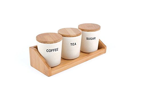 - All natural construction with bamboo fiber containers, secure fitting bamboo lids on a bamboo shelf