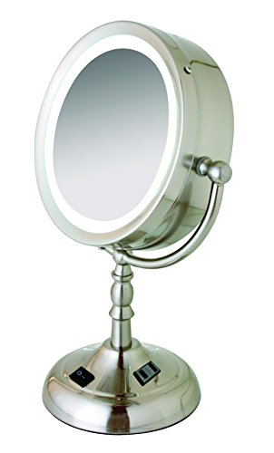 - This mirror has a superior satin nickel finish which goes with all décor adding a touch of elegance. The bright, white light focuses on your face while the 8x magnification allows you to see clearly all small details on yor face for perfect makeup application, eyebrow tweezing, etc. The other 1x mirror give you a regular, overall view of your face and hair. The mirror also comes with an extra electrical outlet for other accessories.