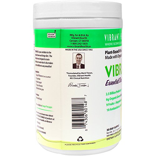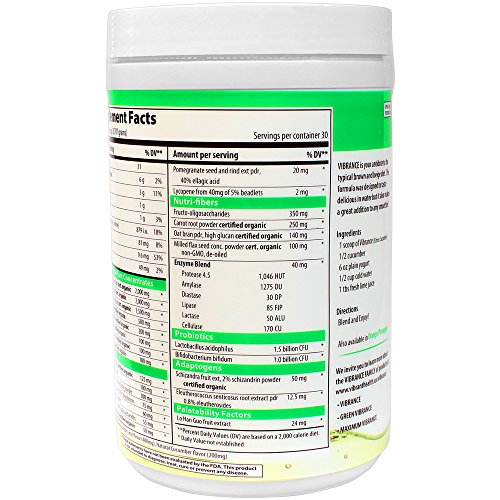 -. Feature : ONE STOP NUTRITION: Coming closer than any other dietary supplement to being the singular product to take in place of all other supplements, the only absent nutrient from this formula are essential fats, in particular the omega-3 fatty acids. A stable form of powdered omega 3s that possesses a shelf life suitable for use in powdered supplements is yet to be developed / HEALTH ON THE GO: It's a challenge to integrate the nutrients we need to feel our best into our busy day to day. Maximum Vibrance is a comprehensive solution. Add one incredibly healthy packet to your favorite beverage or add two packets to your smoothie and take your nutrition with you wherever the day may lead / FUTUREFOOD: Maximum Vibrance is made up of over 100 ingredients from 80 plants, 29 antioxidants, 3g of fiber, 25 billion probiotics, 7 servings of fruits and vegetables, 7 vegetable based digestive enzymes, 20g of protein and much more / DON'T SACRIFICE TASTE: The best dietary supplement in the world will do no one any good if it tastes awful. We use GoVanil Natural, a special extract of vanilla that blocks bitter flavors of foods, to help allow the other natural flavoring ingredients to be fully experienced and provide you with the great tasting nutrition you crave / TRUTH, TRUST, TRANSPARENCY: You will find no misleading proP.R.Ietary blends with Vibrant Health. We fully disclose each ingredient by dose in every product we manufacture.