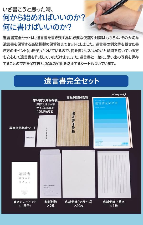 | 自分が死んだ後に残される遺産を、大切な人たちに残したい。そういった願いを文書に残し、その願いを死後に実現してくれるのが遺言書です。しかし、なかなか書く暇がなかったり面倒に思ったりと後回しにしてしまいがち。そういった思いを書き始める決心に変えるのが、この遺言書完全セットです!!書き終えたら、日光東照宮の造営に参加した工匠たちが300年の伝統技術で丁寧に作り上げた桐箱に入れて大切に保管する事が出来ます。 |