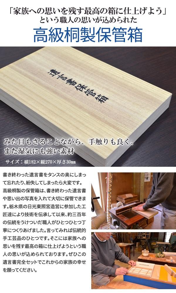 自分が死んだ後に残される遺産を、大切な人たちに残したい。そういった願いを文書に残し、その願いを死後に実現してくれるのが遺言書です。しかし、なかなか書く暇がなかったり面倒に思ったりと後回しにしてしまいがち。そういった思いを書き始める決心に変えるのが、この遺言書完全セットです!!書き終えたら、日光東照宮の造営に参加した工匠たちが300年の伝統技術で丁寧に作り上げた桐箱に入れて大切に保管する事が出来ます。 |