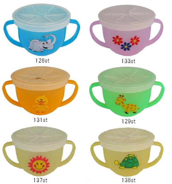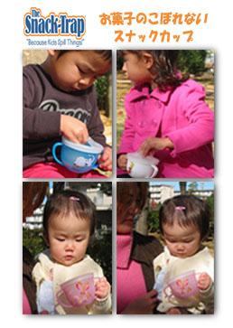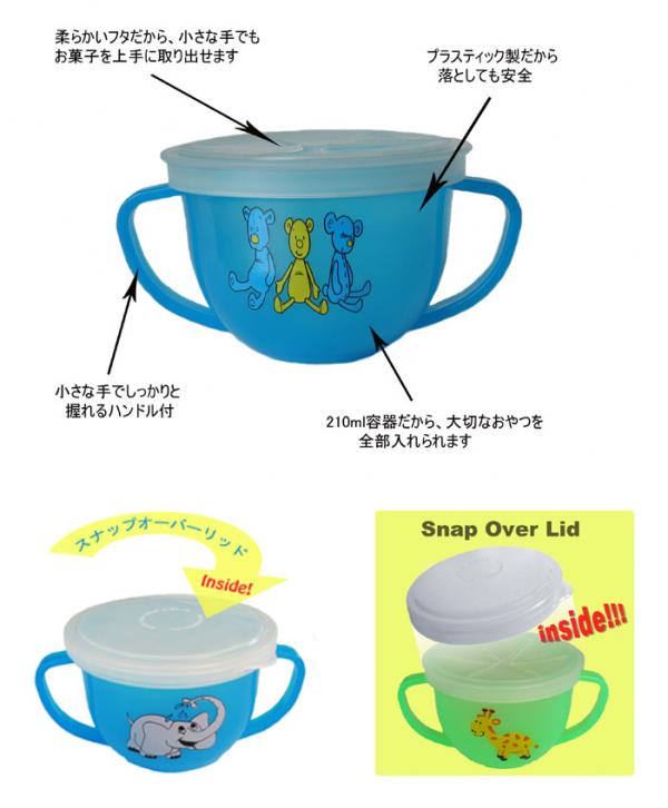 | お家のおやつタイムはもちろん、車の中、ベビーカーでのお出かけも便利。柔らかいフタだから、小さな手でもお菓子を上手に取り出せます。 |