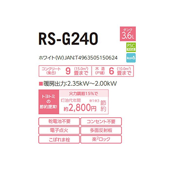 TOYOTOMI 석유 스토브(수동식 발전 건전지 불요) 【한패지 않겠 Pa】 「콘크리트9다다미/목조6다다미」 일본제 화이트 RS-G240(W)
