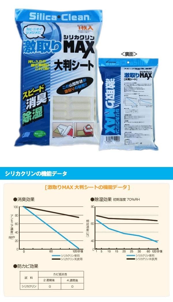★「シリカクリン(R)」シリーズ・「激取りMAX」シリーズとは★ シリカゲルを特許製法でシート状にし、消臭力・調湿力(除湿力)の機能に即効性を持たせた、今までにない製品です。一般家庭・工場・葬祭場・精密機械メーカー等、様々な場面でご使用頂いている実績があります。また、天日干しで機能が再生するECOな製品です。
