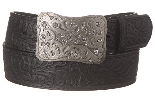 Product Description Dark brown genuine leather belt, western floral embossed with split leather backing, rectangular bow tie rhinestone and pewter western buckle, 1-1/2" wide belt strap 0