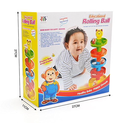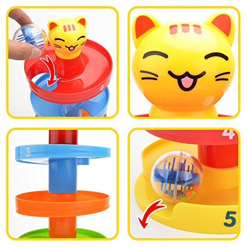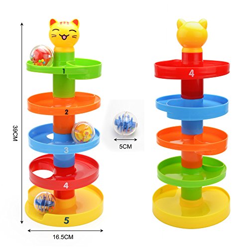 -. Feature : 【toys set】ball ramp includes 3 spinning activity balls, 5-tier and 1 cartoon cat head. Each colored tier is a separate piece and snap easily. / 【3 balls】3 acrylic balls contain colorful beads and shapes that make fun noises when it rolled,which is like a smll beads maze. Easy for toddlers to grasp,they enjoy rattling sounds the balls make and shakes them. / 【acitivity center】5 pieces of towers easily to stack up for activities and can be built sturdy in a snap nearly 15 inches, the kids spent hours playing with it, fetching the runaway balls, and changing the layer colors. / 【whirling fun】rolling ball attracts the baby's attention,develop the baby visual ,hear, hand eye recoginition ability. / 【material and age】made of abs ,a best gift of fun and wisdom for 1 years old up boys and girls. (used under the direct supervision ).