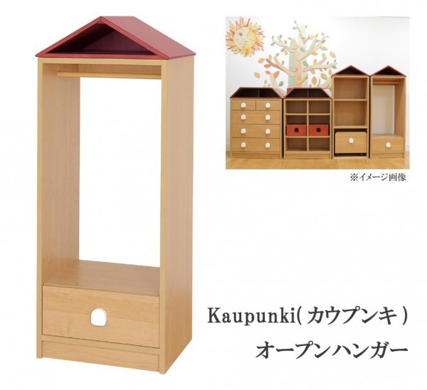 | 三角屋根がキュートなハンガーラックです。引き出しもあるので、細かいものの整理にも便利。一台で、掛ける、置く、しまう収納ができます。屋根の部分にもかわいく飾って、お部屋のアクセントにも。 |