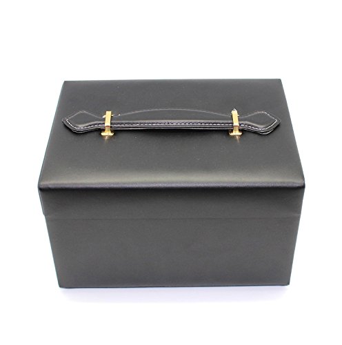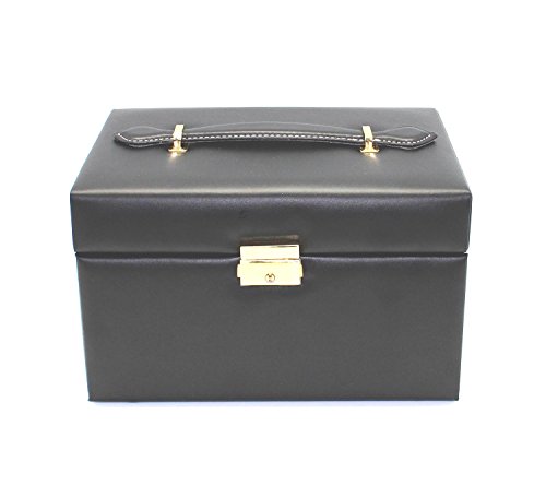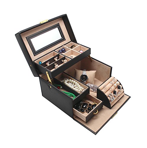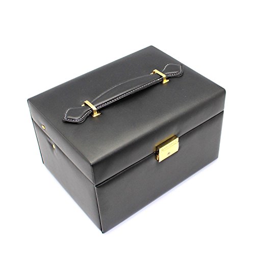 Black Girls Jewelry Box Case Lockable Mirrored Storage Organizer Rings Necklace Faux Leather and Beige Velvet
